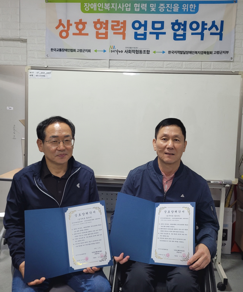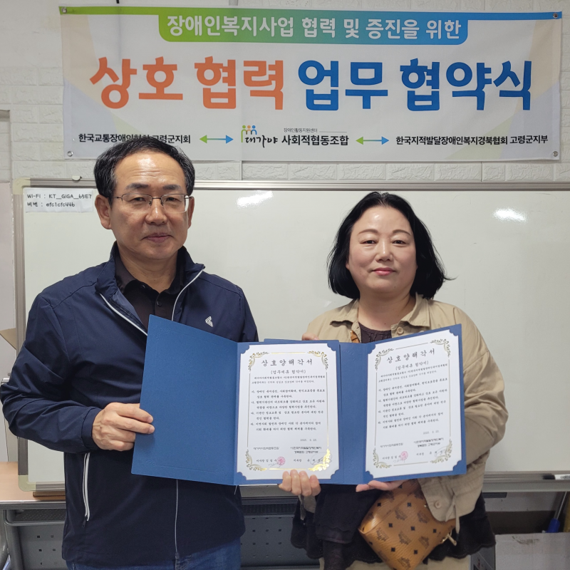 일시 : 25년 9월 23일 12 : 00 장소 : 대가야사회적협동조합 장애인활동지원센터 내 한국지적발달장애인복지경북협회 고령군지부 ( 유재선 지부장 )와 대가야사회적협동조합이 1차협약식, 한국교통장애인협회 고령군지회( 이성구 지회장 )와 대가야사회적협동조합이 2차협약식. 대가야사회적협동조합 장애인활동지원센터의 원활한 운영과 지역사회 내 유관기관과의 협력체계를 구축, 장애인복지사업 협력 및 증진을 위한 상호협력 업무협약식을 체결하였다.